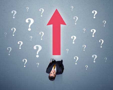 Young contemplating businessman stands in front of a big red arrow and white question marks