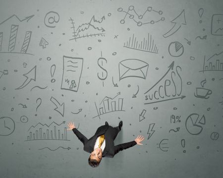 Young contemplating businessman stands in front of business graphics
