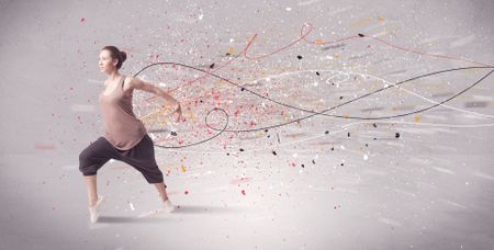 A young contemporary energetic dancer in action in front of a grey wall background with lines, spray dots and splatter concept