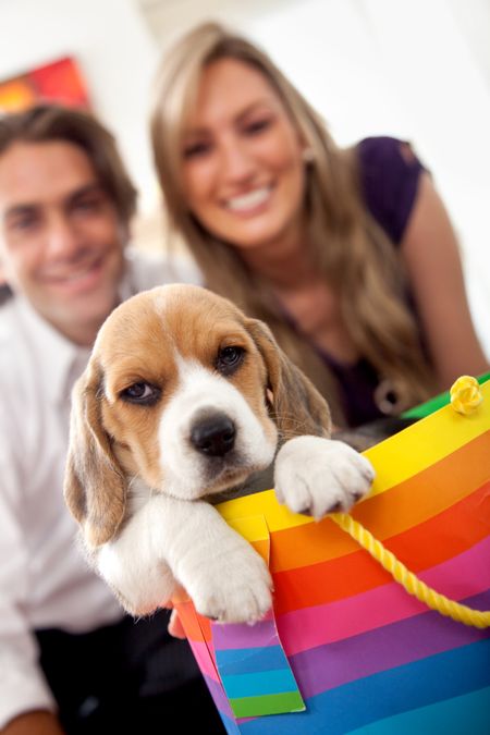 Young couple getting a puppy as a gift