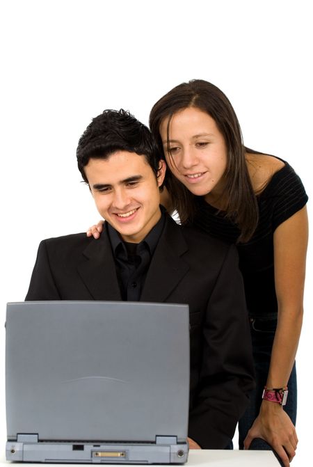 young couple on a laptop computer isolated over a white background