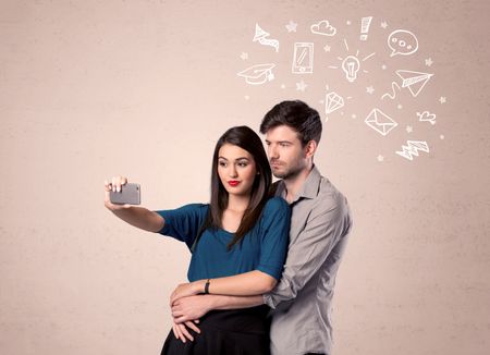 A young couple in love taking selfie with a mobile phone in the handsome guy's hand and drawn media communication icons above them, confused ideas concept