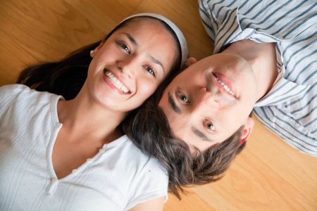 Young couple lying on the floor with heads together
