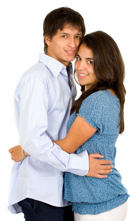 young couple smiling and standing next to each other - isolated over a white background