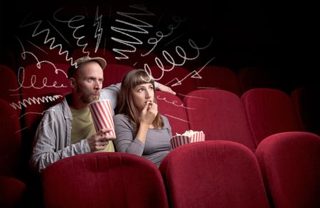 Young cute couple sitting in cinema, and eating popcorn while watching movie with doodle graphics