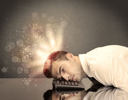 A young depressed business person laying his head on computer keyboard with thoughts exploding from his head illustrated by light beams concept