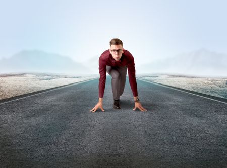 Young determined businessman kneeling before blank running track