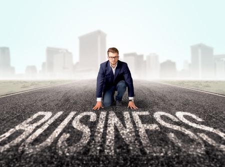 Young determined businessman kneeling before business text
