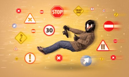 Young driver with road signs around him concept