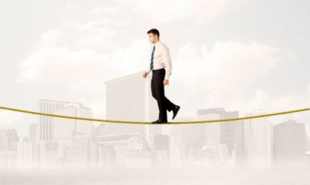 A young elegant businessman walking on tight golden rope in front of city buildings landscape background concept