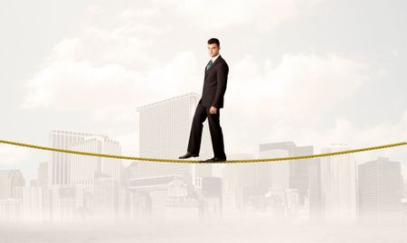A young elegant businessman walking on tight golden rope in front of city buildings landscape background concept