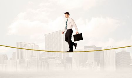 A young elegant businessman walking on tight golden rope in front of city buildings landscape background concept