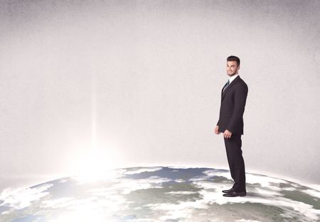 A young elegant office worker standing on top of a drawn world globe while celebrating his successful career concept.