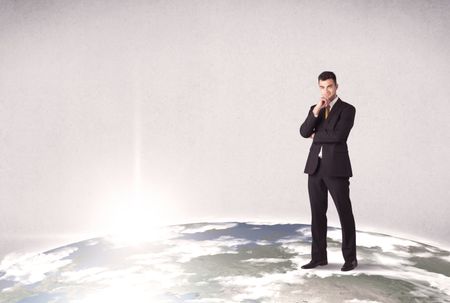 A young elegant office worker standing on top of a drawn world globe while celebrating his successful career concept.
