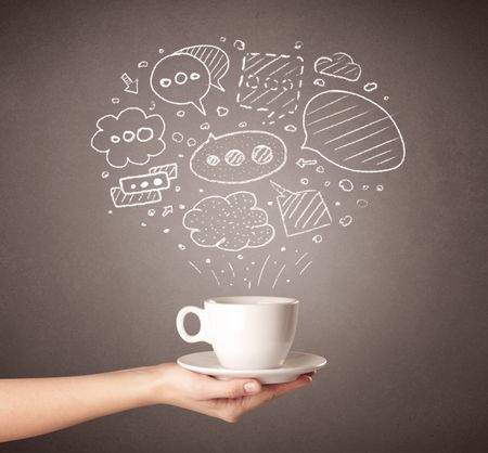 Young female hand holding coffee cup with drawn thought bubbles above it