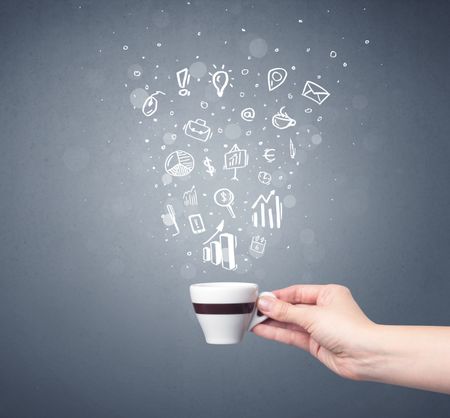 Young female hand holding coffee cup with business related drawings above it