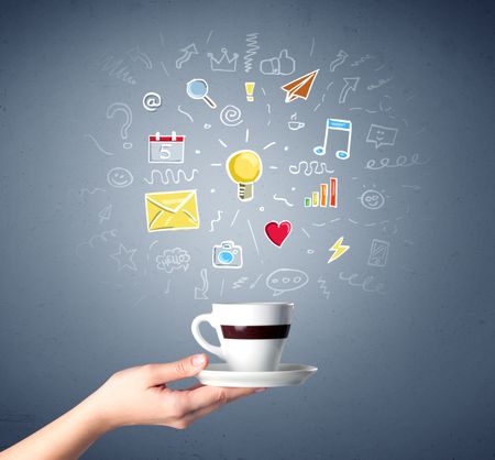 Young female hand holding coffee cup with colorful communication related drawings above it