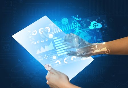 Young female hand holding a tablet with blue graphs