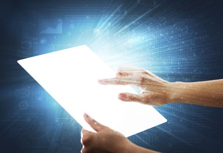 Young female hand holding a tablet with faded charts in the background