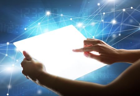 Young female hand holding a tablet with numbers in the background