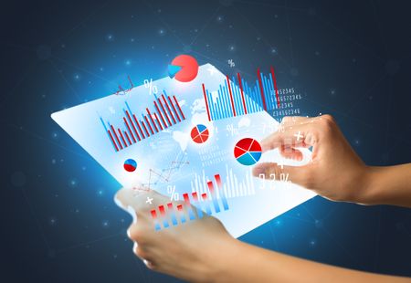 Young female hand holding a tablet with red and blue charts