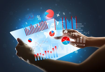 Young female hand holding a tablet with red and blue charts