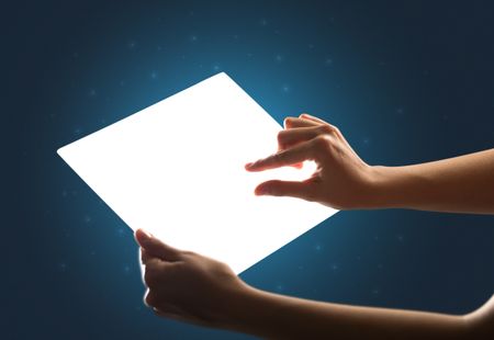 Young female hand holding and touching a piece of glass meant to look like a tablet
