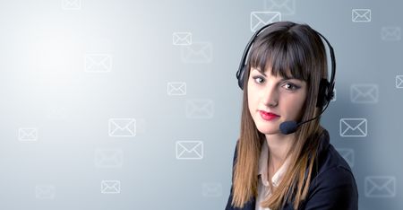 Young female telemarketer with white envelopes surrounding her