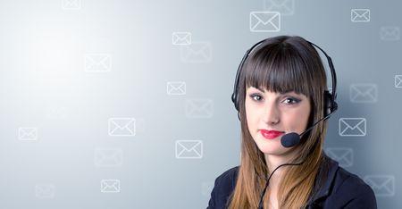 Young female telemarketer with white envelopes surrounding her