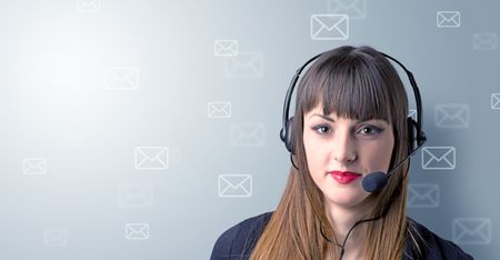 Young female telemarketer with white envelopes surrounding her