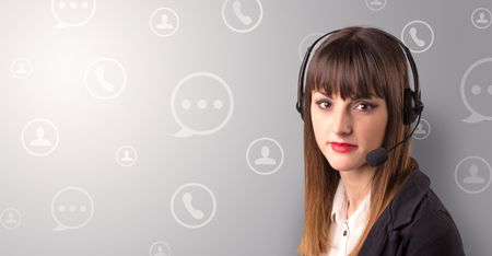 Young female telemarketer with white speech bubbles around her