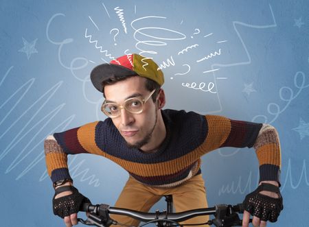 Young foolish crazy rider with doodle on the background