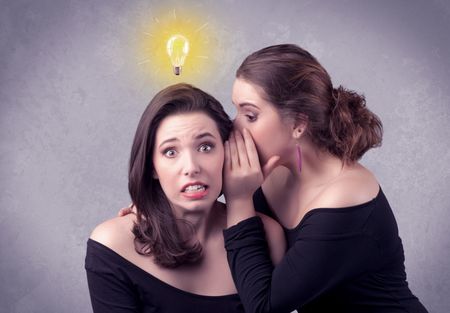 A young girl has an idea illustrated with a drawn glowing light bulb above the head, while a friend whispers a secret in her ear concept.