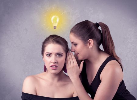 A young girl has an idea illustrated with a drawn glowing light bulb above the head, while a friend whispers a secret in her ear concept.