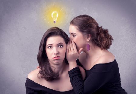 A young girl has an idea illustrated with a drawn glowing light bulb above the head, while a friend whispers a secret in her ear concept.