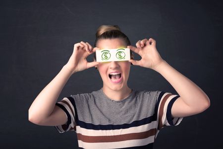 Young girl holding paper with green dollar sign concept