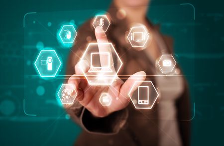 Young girl pressing virtual media type of buttons