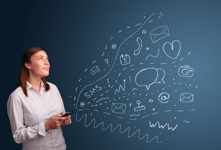 Young girl typing on smartphone with various modern technology icons and symbols