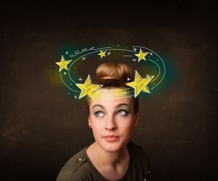 Young girl with yellow stars circleing around her head illustration