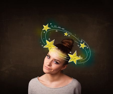 Young girl with yellow stars circleing around her head illustration