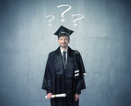 Young graduate teenager with question marks drawn over his head