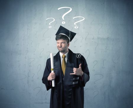 Young graduate teenager with question marks drawn over his head