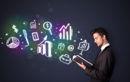 Young guy reading a book with business icons coming out of the book