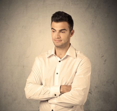 A young handsome business person making facial expression in front of clear, empty concrete wall background concept