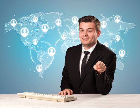 Young handsome businessman sitting at a desk with a blue world map behind him