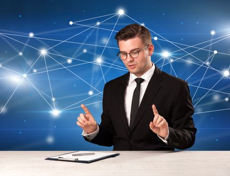Young handsome businessman sitting at a desk with a blue connection graphic behnid him