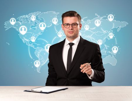 Young handsome businessman sitting at a desk with a blue world map behind him
