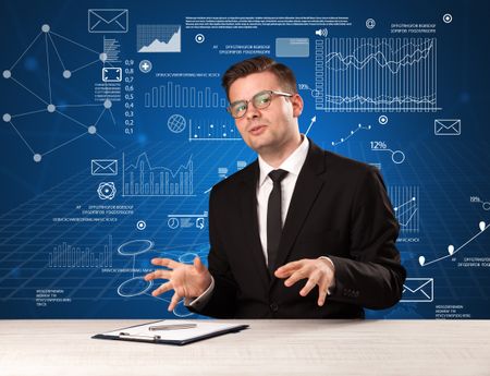 Young handsome businessman sitting at a desk with blue charts and data behind him
