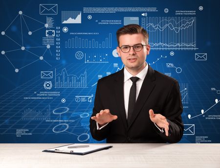 Young handsome businessman sitting at a desk with blue charts and data behind him