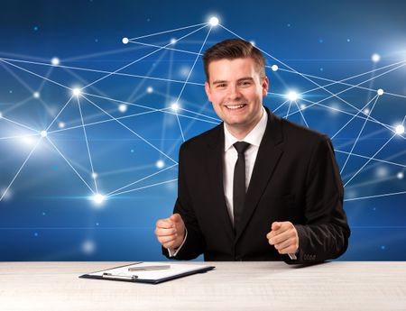 Young handsome businessman sitting at a desk with a blue connection graphic behnid him
